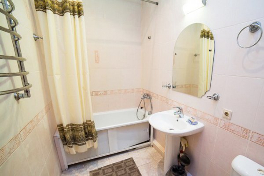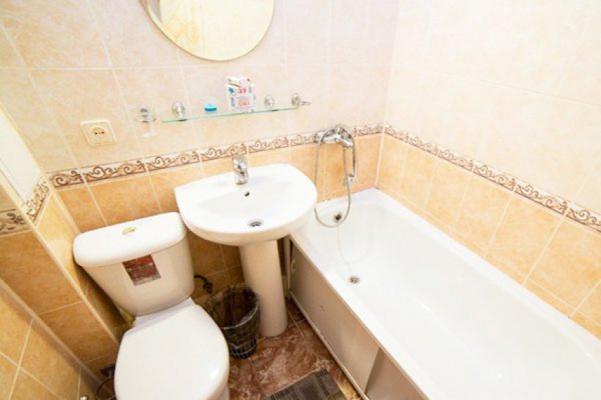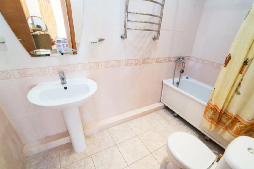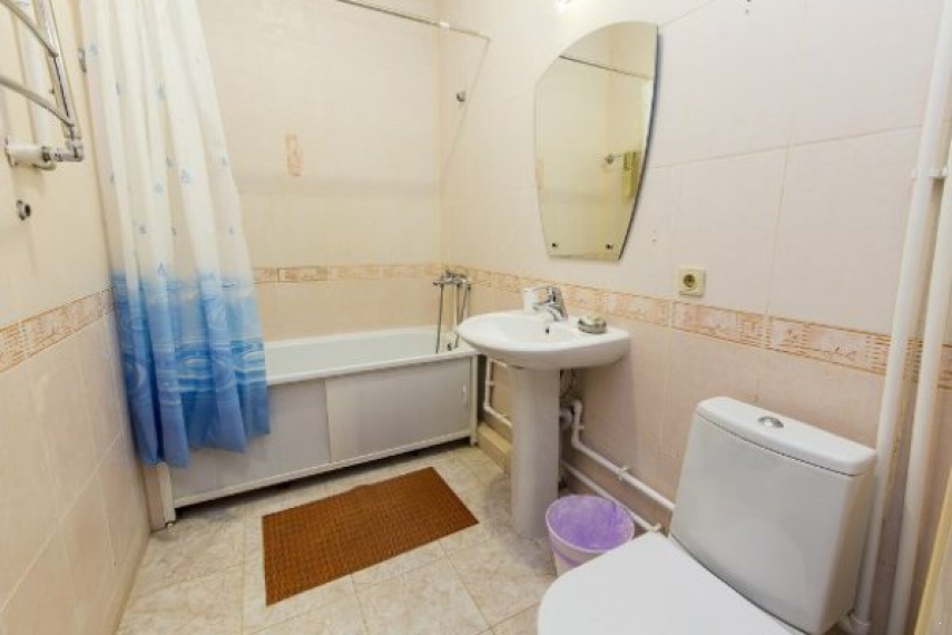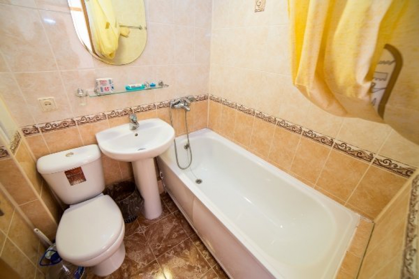 Санузел – умывальник, зеркало, унитаз, ванна, полотенца, фен, халат, тапочки.