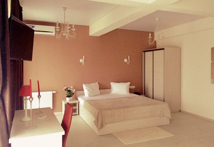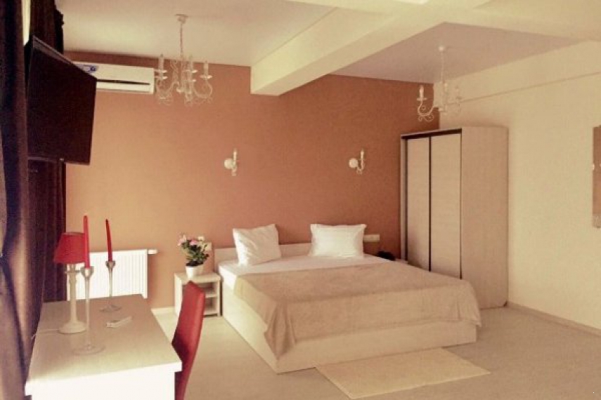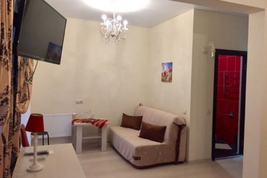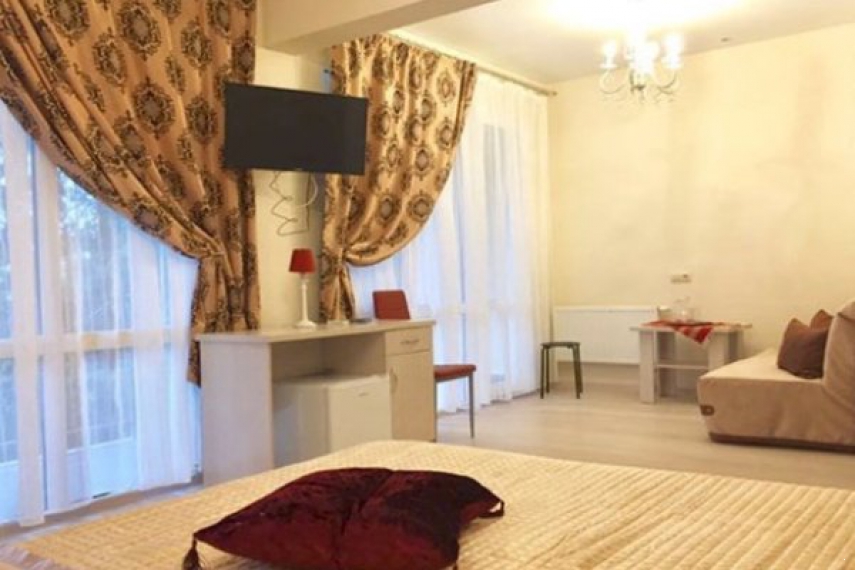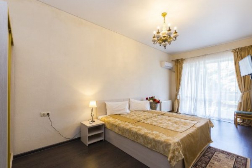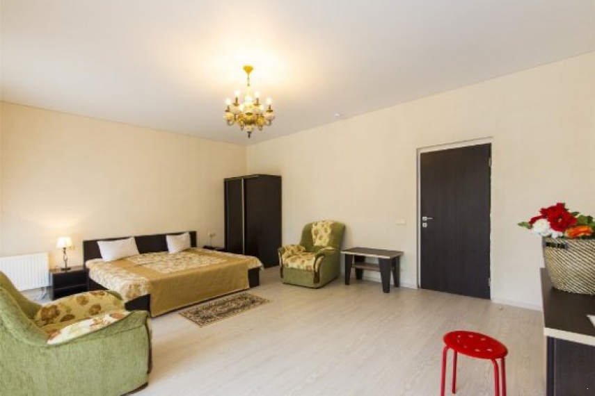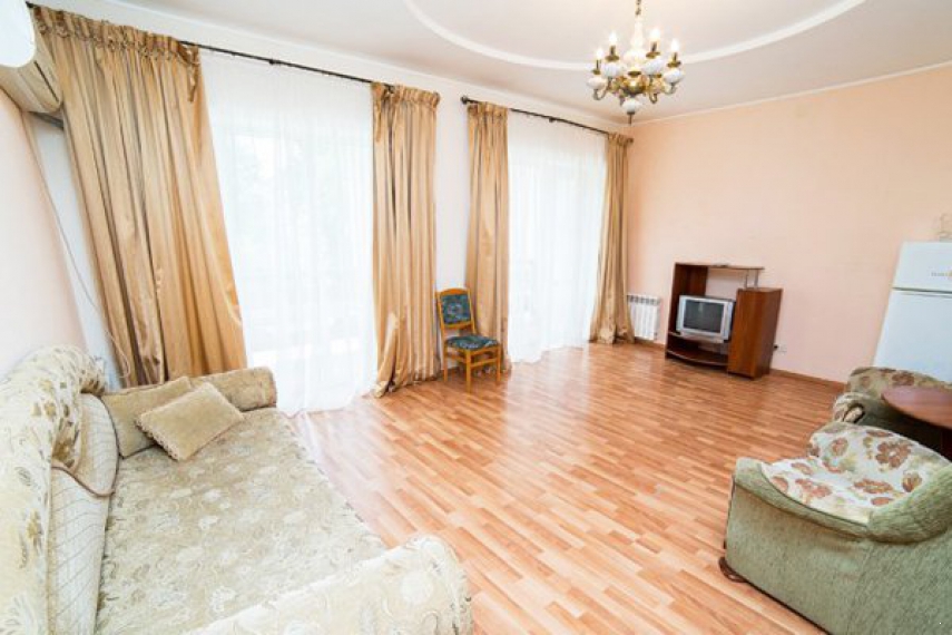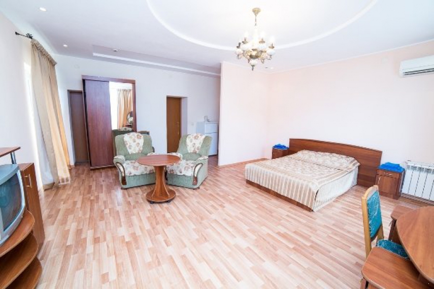 Оснащение: одна двуспальная кровать, прикроватные тумбочки, шкаф, стол, стулья в спальне, мягкие диван, журнальный столик в гостиной; кондиционер, телевизор, холодильник, телефон.