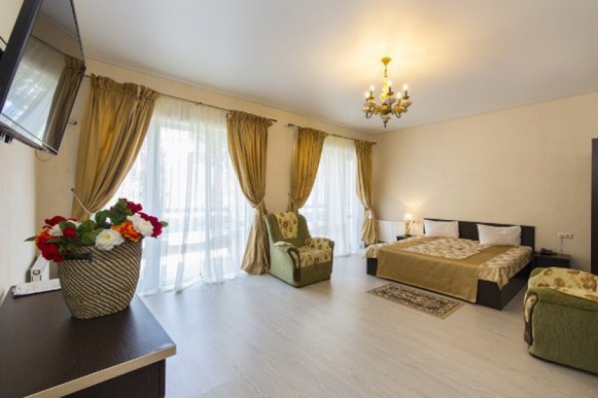 Оснащение: одна двуспальная кровать, прикроватные тумбочки, шкаф, стол, стулья, мягкие кресла, журнальный столик, кондиционер, телевизор, холодильник, телефон.