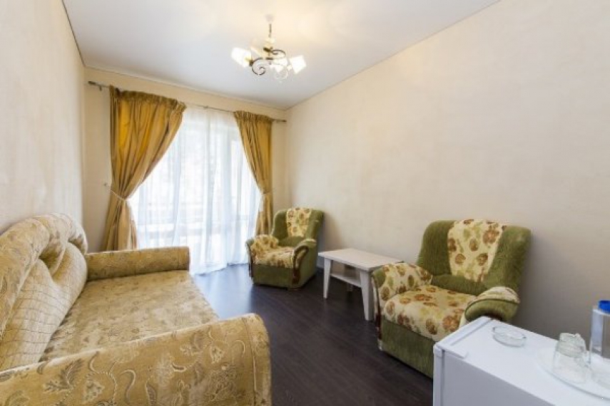 Оснащение: две односпальные кровати (соединенные), прикроватные тумбочки, шкаф, стол, стулья в спальне, мягкие диван, журнальный столик в гостиной; кондиционер, телевизор, холодильник, телефон.